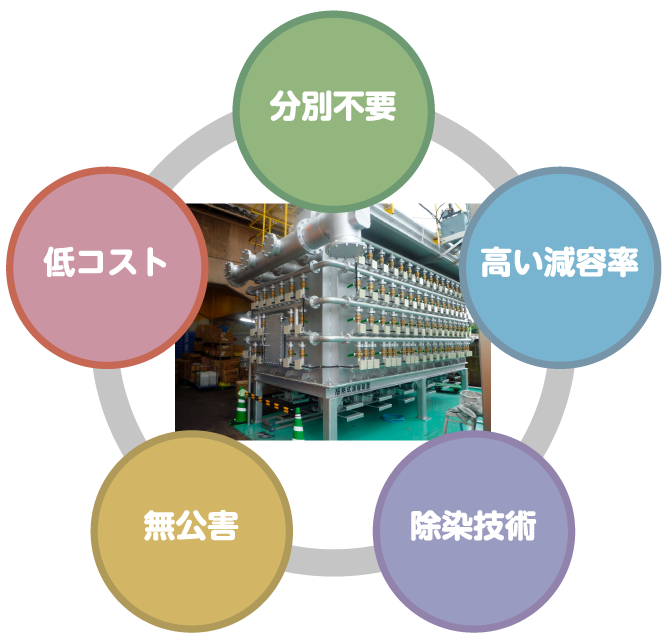 | 20㎥以上の大型装置(行政と許可調整必要) | 論文により、熱分解炉装置として認可予定(令和3年春頃)新しい技術の為、法律上の壁に阻まれ、導入について環境省と協議を重ねています。現段階ではICAE (国際応用物理学会)に推挙され論文掲載されております。 | |